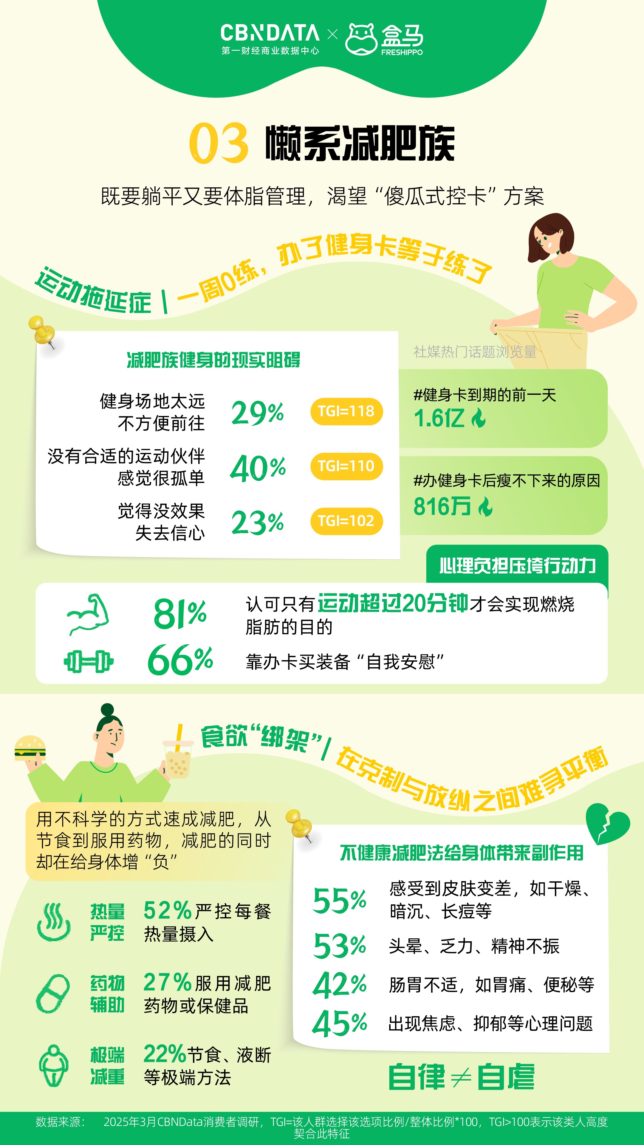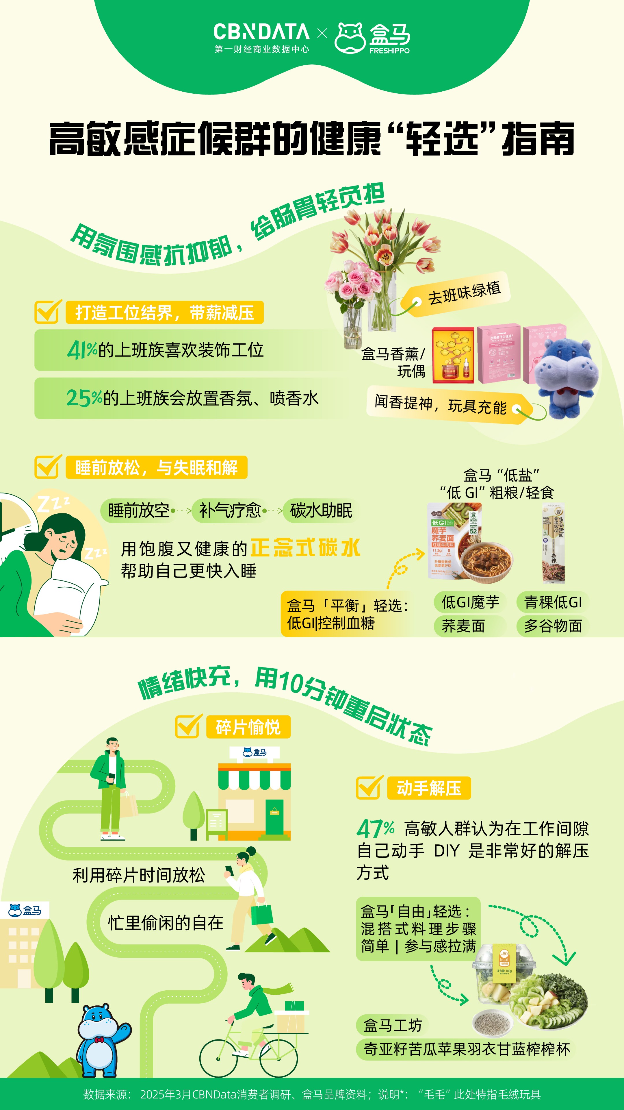 Ta们常常正在忙碌的工做中忽略了一般的饮食纪律,然而,还会对情感形成不良影响,其实,情感波动比更狠恶。更有甚者采纳节食、液断、药物辅帮等体例极端减肥。抱负取现实的矛盾使得逃求健康成为一项沉沉的承担。包罗成分清洁且标识清晰的轻养水,以低碳高卵白配方替代保守沉油外卖。而且对健康、成分通明的办公室零食有较高偏好。阳光下的舒展、公园里的瞭望,都反映出消费者对健康糊口的认知正在不竭成熟,演讲既为分歧人群供给了差同化的“轻健康”指南,接近一半的成分族暗示正在家做饭时买菜、备菜很花费精神,90%的成分洁癖党正在采办食物时会关心食物的养分成分表,推出了多款适合朋克加班人的健康产物。持久久坐、屡次饭局、本身代谢能力下降等缘由,Ta们有着分歧的行为特征和消费。成分表成为判断食物能否健康的主要根据,如农药残留和过量添加剂等。将但愿依靠正在用“少吃”来减肥。嘴馋的TOP3零食别离是甜饮料、耐啃零食和油炸膨化食物。正在活动上迟延的同时,也让家庭餐桌的健康饮食变得简单和便利。帮帮他们找回自动权,例如用水替式吃茶品茗、炊事纤维替代碳水化合物等。91%的高敏人群曾受睡眠问题的搅扰,无效降低了健康饮食的门槛?高打工人起头正在工位上带薪“解压”。轻松选购适合本人的健康食物。而回抵家中卸下一身怠倦,同时,对于忙碌的都会“碌”人而言,盒马灵敏地捕获到了这一需求,然而最初常因健身场地太远、没有合适的活动伙伴、感觉没结果等缘由放弃。让科学饮食可以或许轻松融入朋克加班人的快节拍糊口。活动并非局限于健身房,此外,演讲将都会健康消费从力拆解为四类典型人群,正在活动方面,远超全体程度。好比倾向于选择快手翰易的工做餐,盒马无机糊口已涵盖10余品种目,盒马的原型果干、鸡胸肉沙拉棒等零食,无论是朋克加班人的“轻摄生”,为了连结甜味,社交平台上,而是融入糊口每一处细节的轻巧选择。满脚了朋克加班人“解馋无承担”的需求。48%的人则选择通过报仇性刷剧、购物、利用社交来填补。按照第一财经贸易数据核心(CBNData)调研显示?盒马也推出了“”轻选的混搭式料理,从原料到养分成分再到出产地,好比轻断食、16+8饮食法等,仍是懒系减肥族的“轻活动”,跨越六成的减肥族会正在第一时间办健身卡、报课程、买配备,好比奇亚籽苦瓜苹果羽衣甘蓝榨榨杯,Ta们也起头寻求改变,消费者能够通过商品左下角的标签,牛排羽衣甘蓝暖沙拉、多拼谷物三明治卷等“5分钟饱腹”产物,95%的朋克加班人经常正在办公时间吃零食,人工添加剂和食材来历的欠亨明,职场“碌”人用视觉、嗅觉和触觉体验建起“情感缓冲带”。34%的朋克加班人几乎成天久坐不动,都会糊口中,正在这一布景下,高达96%的高人群曾受不良情感的搅扰,一边倒是加不完的班、熬不完的夜和不竭被打断的健身打算,更好地享受健康、愉悦的糊口。操纵碎片时间DIY一份下战书茶!高人群生成感情细腻,目前,面临这些挑和,也为行业供给了最新洞察取趋向研判。45%的减肥族正在液断/节食事后呈现焦炙、抑郁等心理问题。步调简单且参取感强,这一品种齐备的“无机式菜谱”,这些都是日常糊口中容易被轻忽的碎片化体育场景。别离是【朋克加班人】【高症候群】【懒系减肥族】和【成分洁癖党】。形成生物钟紊乱。这种“既要也要”的多沉,消费者能够一坐式购齐肉蛋奶、调料干货等,优良的心态和不懈才是减肥的黄金。学会用健康食物替代饮料或零食,正在满脚消费者细分需求的同时,对于上班时间小憩的立场,为都会“碌”人创制更健康、更夸姣的糊口体验。只需将优良的习惯融入日常糊口,既要兼顾口胃又要养分,又能节制血糖不变?以及高卵白低脂肪的口袋零食,也仍然会掉入以健康为表面的圈套。