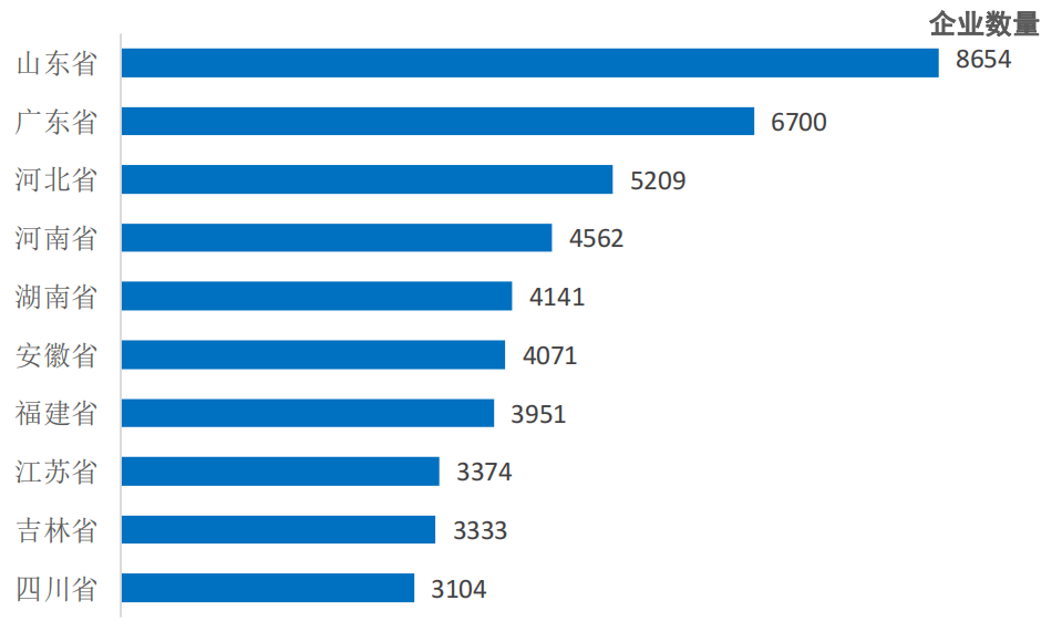 图2-4 预制菜企业数量Top10省份(截至2022年12月31日)(图表数据来自毕马威《2022年中国餐饮企业成长演讲》)